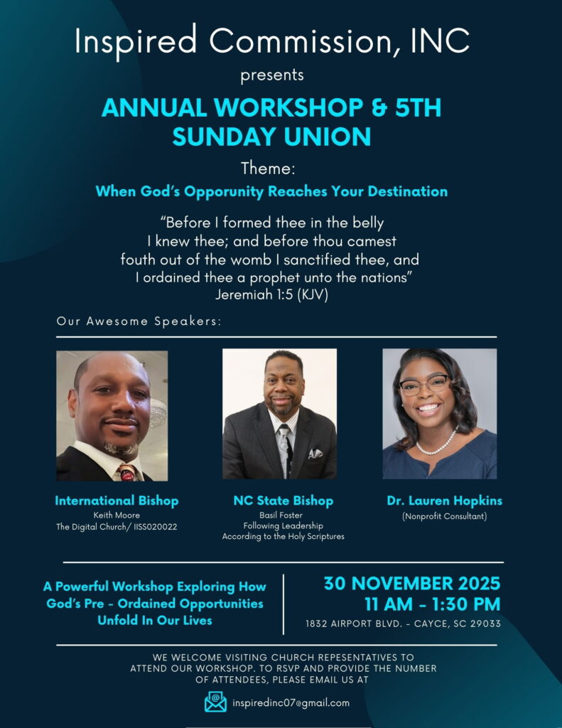 If you are interested in attending the Annual Workshop & 5th Sunday Union, please email inspiredinc07@gmail.com to RSVP.